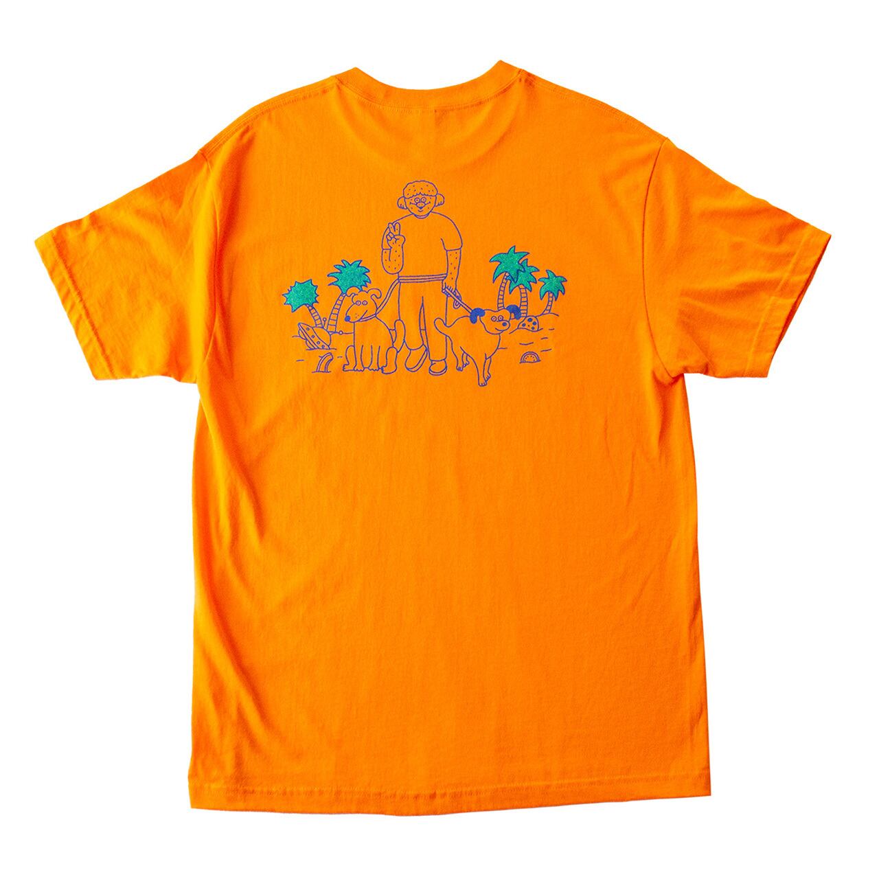 あいつ(犬)がツーピースをしながら犬を二匹お散歩しているバックプリント。